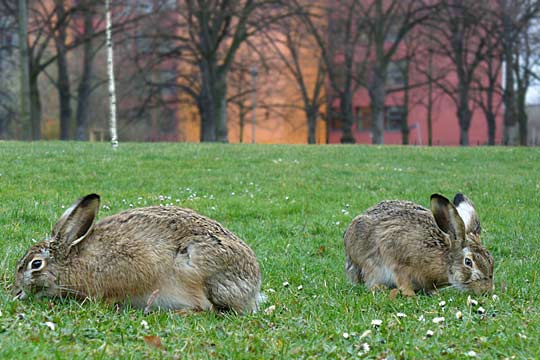 02.03.2008, Sonntagnachmittag, Lindenhofwiesen, Susikind (links) und Freund Seit Donnerstag ist das Wetter etwas schlechter, und die seit letztem Sommer hier üblichen Hundetreffen finden nicht statt. Das wird von unseren Nachwuchshasen gleich dankbar zur Kenntnis genommen; sie konnten heute gegen 16 Uhr etwa eine halbe Stunde lang ungestört eine erste Mahlzeit einnehmen - welche an "normalen" Tagen in der Regel wegfallen muss (da zeigt Susikind sich eigentlich erst, wenn es dunkel wird). Am Donnerstagnachmittag hat Susikind hier alleine gegrast. Moni ist wieder da!!! Wo hat sie nur die zwei vergangenen Wochen gesteckt ...? |