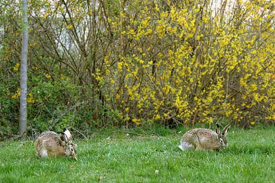 25.03.2008, Dienstagabend, Lindenhofwiesen, Susann (rechts) und Toni Susann ist derzeit Tonis Lieblingshäsin; mit ihr ist er regelmäßig zusammen. Von Susi will Toni kaum noch was wissen; wenn er sie mal trifft, schnuppert er ein bisschen an ihr herum und lässt sie dann in Ruhe. |