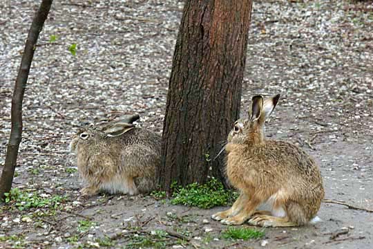 10.04.2008, Donnerstagmorgen, Gelände der 83. Schule, Susi (links) und Bertram Susis "heißer" Tag kommt etwas eher als von mir erwartet. Toni ist auch mit von der Partie, muss aber außerhalb des Schulgeländes warten - da passt Bertram auf. Als es gegen 7.30 Uhr unruhig wurde in der Schule, bekam als erster Bertram Angst. Dadurch konnte Toni mal zu Susi; die beiden sind dann aber auch bald geflüchtet vor dem Trubel. Am Abend war Susi nicht auffindbar - wie üblich; auch die Hasen hatten keinen Erfolg; Toni hat besonders intensiv gesucht. |