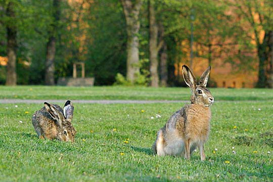 24.04.2008, Donnerstagabend (3), Lindenhofwiesen, Susann (vorn) und Toni Susann ist sehr vorsichtig. Wenn sich irgendwo etwas bewegt, merkt sie auf, und sie gerät auch viel schneller in Panik als die anderen Hasen. Mit ihren 7 1/2 Monaten ist sie immer noch sehr klein; ihre Mutter war in dem Alter längst ausgewachsen. |