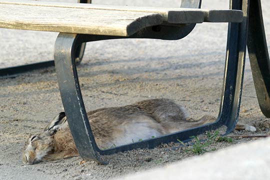 27.04.2008, Sonntagabend, Gelände der 83. Schule, Susi relaxt unter einer Bank Susi nutzt die schulfreien Tage oft, um sich mal richtig ausschlafen zu können. Hier muss sie auf nichts aufpassen; höchstens von streitenden Amseln oder Spatzen wird sie manchmal erschreckt. |