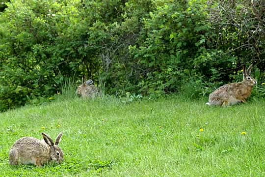 30.04.2008, Mittwochabend, Lindenhofwiesen, v.l.n.r.: Susi, Toni, Susann Zwei sehr seltene Ereignisse: erstens, dass mal alle drei hier in den Sträuchern den Tag verbracht haben, und zweitens, dass sie gleichzeitig und auch noch so dicht beieinander grasen. |