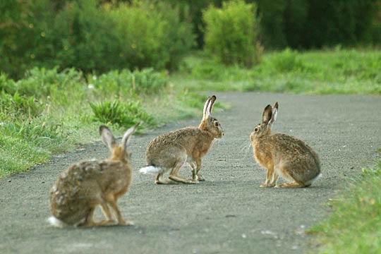 03.05.2008, Samstagmorgen (3), Mittelganghaus-Wiese, v.l.n.r.: Toni, nH, Susann Der neue Hase hat sich inzwischen an meine Anwesenheit "gewöhnt" (weil ich mich nicht mehr bewegt habe, hat er mich einfach vergessen) und kann sich wieder voll auf Susann konzentrieren ... und Toni muss wieder zuschauen. |