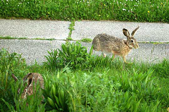 05.05.2008, Montagabend, Nachbarviertel, Susann und Susi (rechts) Susi hat, von den Lindenhofwiesen kommend, mal unser Nachbarviertel besucht ... wo sie auf ihre Tochter Susann traf. Und Susann begann bald herumzuschnüffeln - und hat sich dann einfach nur eine Baumscheibe auf der Wiese hier ausgesucht ... um über Nacht dort zwei Babys zu bekommen. Zu diesem ungünstigen Ort kam noch ein großes Pech: morgen sollte Gras gemäht werden! - - Ich habe die Häschen zwar am Dienstagmorgen "umgebettet" - fünf Meter weiter zu einem Mini-Strauch -, was aber auch nichts genützt hat; sie sind vielleicht später ins Gras gelaufen ... |