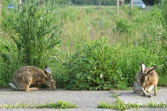 20.05.2008, Dienstagmorgen, Nachbarviertel, Susann (rechts) und Toni Toni ist nicht mehr sehr oft mit Susann zusammen; das ist so seit Anfang Mai, seit die Hasen sich nicht mehr auf den Lindenhofwiesen aufhalten, weil eine neue Katze die Strauchlandschaft dort unsicher macht. Von Sonntagabend an war Susi vergessen. Toni hat sich um Moni gekümmert, und Bertram ist wieder verschwunden, wie beim letzten Mal; er ist wohl nur noch wegen Susi hier bei uns. |