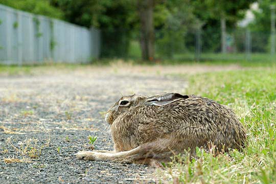 21.05.2008, Mittwochabend, Weitsprunganlage der 83. Schule, Susi Gestern Morgen hat Susi noch ein bisschen herumgeschnüffelt, sich dann recht bald einen Platz in dem Sträucherstreifen neben der S-Bahn-Wiese ausgesucht und sich da hingesetzt. Am Abend fand ich sie dann erst spät, im Schulgelände ... aber nicht wie eine frischgebackene Hasenmutter, sondern eher schläfrig ... Seitdem hat sich nicht mehr viel getan, und Susi benimmt sich wieder so, als ob von Hasenbabys gar keine Rede mehr sei. Irgendwie vermisse ich bei ihr den Ehrgeiz früherer Tage ... sie rennt auch nicht mehr so viel herum wie früher ... |