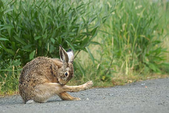 01.06.2008, Sonntagmorgen, Mittelganghaus-Wiese, Susann Susann ist derzeit meistens allein mit sich - will sie vielleicht auch sein. In den letzten Tagen hat sie sich jedenfalls als etwas kratzbürstig erwiesen: wenn ich ihr zu nah kam, lief sie gern gleich ein paar Meter weit weg; bisher war sie da toleranter. Die Hasen, die sich für sie interessieren, sind Toni und der neue Hasenmann; beide waren ja bei ihrem letzten "heißen" Tag dabei. Bei Bertram weiß ich's nicht so; es spricht viel dafür, dass er ihr Vater ist, was möglicherweise ja auch bei Hasen eine Rolle spielt. Ich werde die Sache im Auge behalten. |