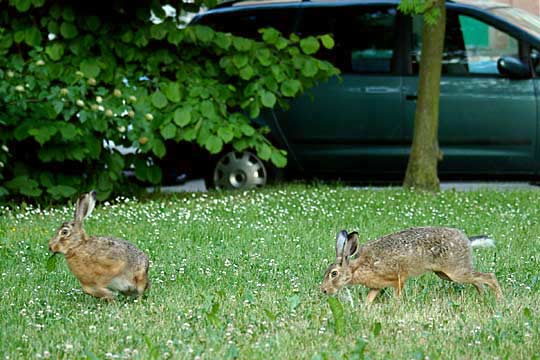 06.06.2008, Freitagabend, Wäschetrockenplatz, Moni (links) und Toni Tonis Lieblingshäsin ist jetzt Moni - er ist seit drei Wochen fast jeden Abend mit ihr zusammen. Susann und Susi scheinen vergessen zu sein; zu ihnen macht er nur noch kurze Abstecher. |