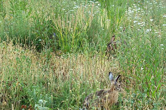 09.06.2008, Montagmorgen, Mittelganghaus-Wiese, Toni (unten) und neuer Hase Das ist Susanns (planmäßiger) "heißer" Tag. Ich bin etwas spät dran, weil ich den Morgen natürlich bei Susi verbracht hatte; und nun ist schon überall Betrieb, sodass sich die Hasen in die Wiese zurückgezogen haben. Susann ist übrigens auch da, nur nicht sichtbar (im hohen Gras, etwa einen Meter links von dem neuen Hasen). Bertram war heute wieder nicht dabei, wie letztes Mal; er war auch lange nicht bei Susi. Aber am Abend bin ich ihm begegnet, bei meiner Suche nach Susann - die ich aber nicht fand, weil sie sich vor den suchenden Hasenmännern versteckt hielt. |