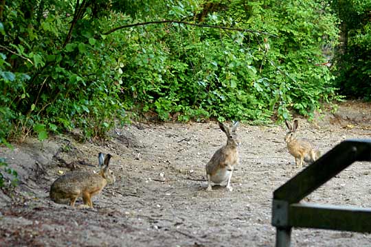 23.06.2008, Montagmorgen (1), Sandkasten der 83.Schule, Toni, Susi, neuer Hase Nun ist zum ersten Mal auch der neue Hase (rechts im Bild) bei Susis "heißem" Tag mit dabei. Die Kräfteverhältnisse sind etwas unklar: auf freiem Felde (vorhin, Wiese an der S-Bahn-Strecke) beherrscht der neue Hase sowohl Toni als auch Bertram; hier aber fühlt er sich etwas unsicher ... und sogar Bertram hat sich mal kurz von Toni einschüchtern lassen. Susi war hier noch in dem Glauben, sie könne sich ungestört schlafen legen (jedesmal derselbe Irrtum) ... doch bald entschloss sie sich zu einem Fluchtversuch. |
