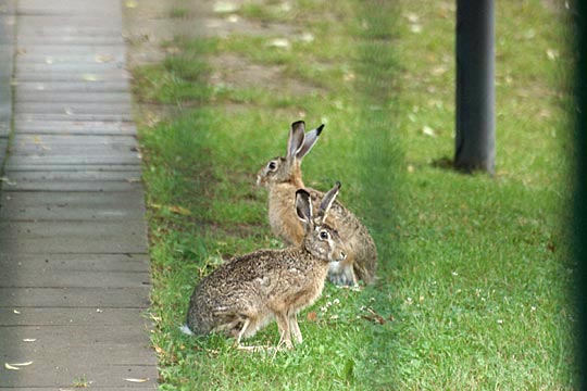 07.07.2008, Montagmorgen, Förderschule, neue Häsin (vorn) und neuer Hase Nach einer geduldigen "Verfolgungsjagd" war mir nun doch noch ein Foto mit den beiden neuen Hasen geglückt - das war aber auch Sekundensache, denn die neue Häsin ergriff gleich danach wieder die Flucht; sie ist momentan sehr scheu - wenn sie mich nur von Weitem sieht, läuft sie schon weg. Wo ist Tonis Interesse für unsere Häsinnen geblieben? ... Heute Abend habe ich ihn endlich mal wieder getroffen - wohlauf, allerdings allein mit sich - nachdem er schon wieder 1 1/2 Wochen "wie vom Erdboden verschluckt" war. |