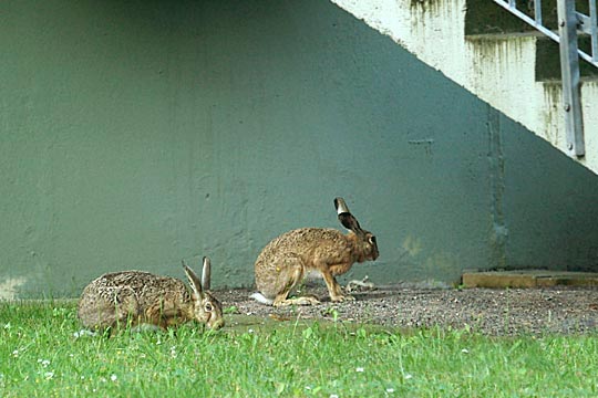 23.07.2008, Mittwochmorgen, zwischen Nachbarviertel und unserm Viertel Das sind Moni (links) und Bertram. Monis "heißer" Tag ...? - weil Bertram noch so spät an ihr hängt und Moni offenbar nicht weiß, wohin sie schlafen gehen soll? Das war nur die Anbahnung, der richtige "heiße" Tag sollte erst morgen sein ... der neue Hase machte wieder den Chef und ließ Bertram nicht ran; und Toni suchte Moni an der Schönauer Straße statt im Nachbarviertel, wo sich das Ganze abspielte (um Toni mache ich mir Sorgen: er scheint nicht mehr so ganz fit zu sein). - - Leider: als es hell genug zum Fotografieren war, war schon alles vorbei - Moni hatte sich versteckt. |