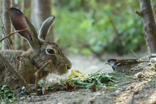 26.07.2008, Samstagabend, Gelände der 83. Schule, Susi und Spatz Das gelbe Etwas, von dem Susis Nase so magisch angezogen wird, ist zerbröselte Banane. Die Spatzen fressen so was auch gern; sie wissen schon lange Bescheid und kommen gleich angeflogen, wenn sie mich in Susis Nähe sehen. Den Spatzen tut Susi nichts. Aber als das Eichhörnchen, das hier manchmal vorbeikommt, mal neugierig war und sich ebenso nah herantraute wie hier der Spatzenmann, hat sie nach ihm geschlagen; doch sie hat es nicht getroffen, da es im selben Moment nach oben sprang und sich an einem Strauch festhielt. |