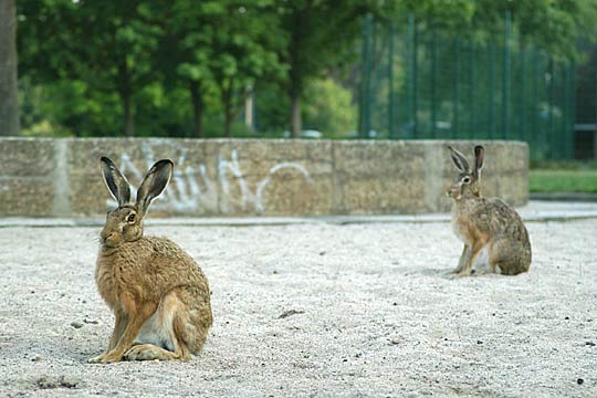 06.08.2008, Mittwochmorgen, Parkallee, Nashorn-Sandkasten, Susi und Bertram Nach Susi (rechts) musste ich heute Morgen länger als sonst suchen. Sie war noch da, wo sie am Montag ihre Babys bekommen hatte (im "weit entfernten" Viertel, ziemlich weit stadteinwärts), wo ich sie natürlich nicht vermutet hatte, da ich den Ort auch noch nicht kannte. Kaum im Bereich der Parkallee angekommen, stürzte sich auch schon Bertram auf sie. Ich hatte fast das Gefühl, hier käme noch mal ein "heißer" Tag zustande - womit ich nicht ganz falsch lag. |